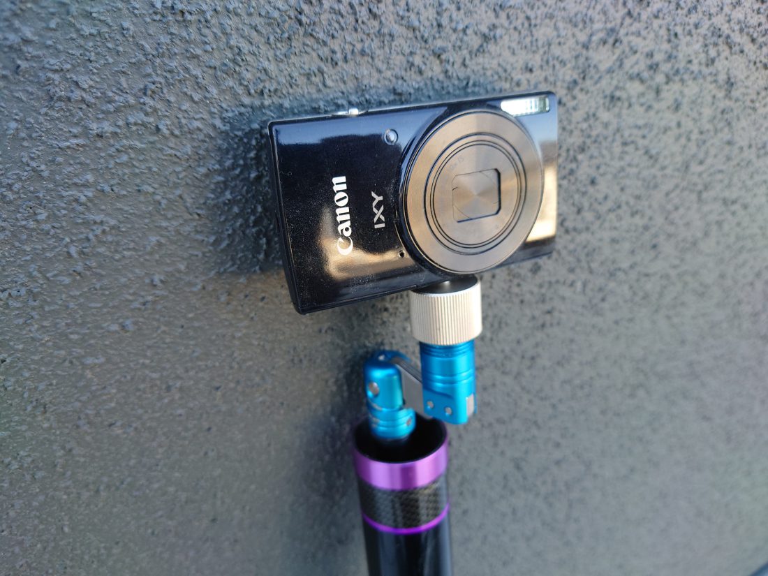 特に決まった名前はない道具ですが、あえて名前をつけると「玉の柄カメラ」となるのでしょうか。。。そのまんまです。玉の柄にWi-Fi接続可能なデジカメを取り付けたものです。